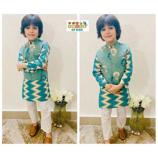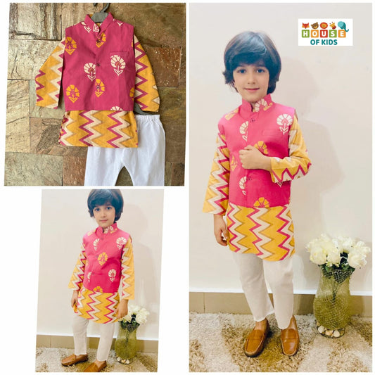 Boys Zig-Zag Kurta Pajama with Floral Jacket Set