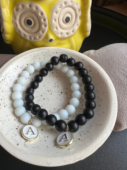 Black and White Matching Pair Bracelet with Initial - Enter Initials in Textbox below Size Selection for Personalisation - Set of 2