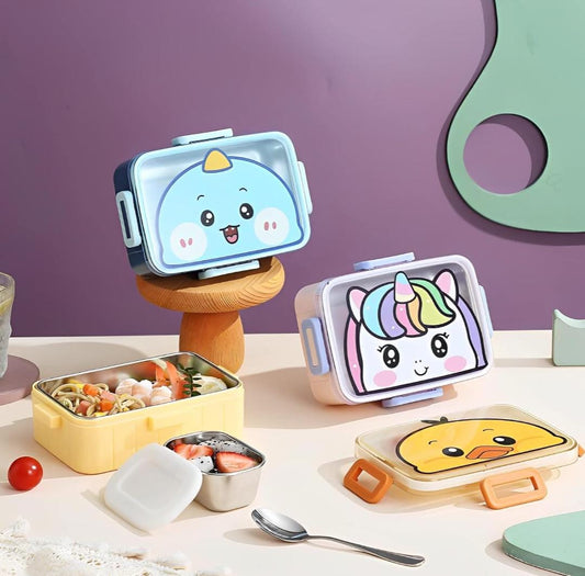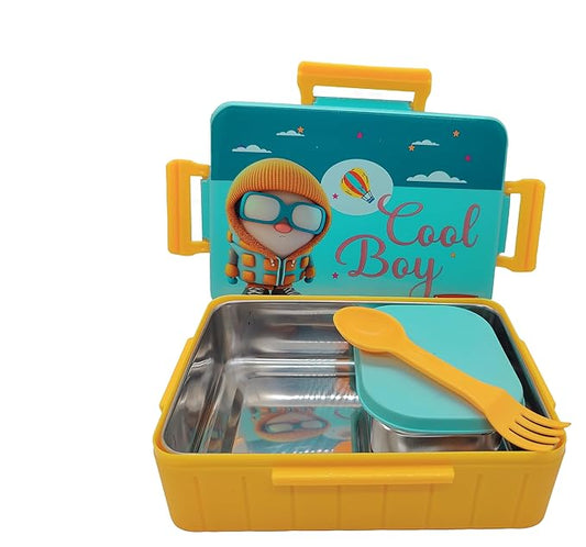 HOK Cartoon Printed Stainless Steel Lunch Box with Veggie Box and Spoon