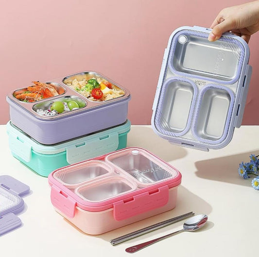 HOK Stainless Steel 3 Compartment Leakproof Lunch Box with Steel Spoon & Chopstick