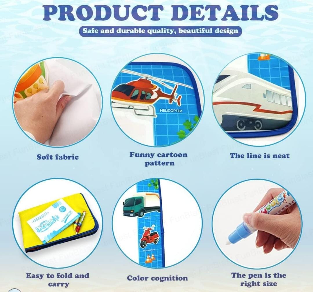 - Include - Water Doodle Mat for Toddler, 1 Water Doodle Mat with 2 Magic Water Pen, Size - 79 X 49 CM Note- The drawing will disappear in 5 minutes
